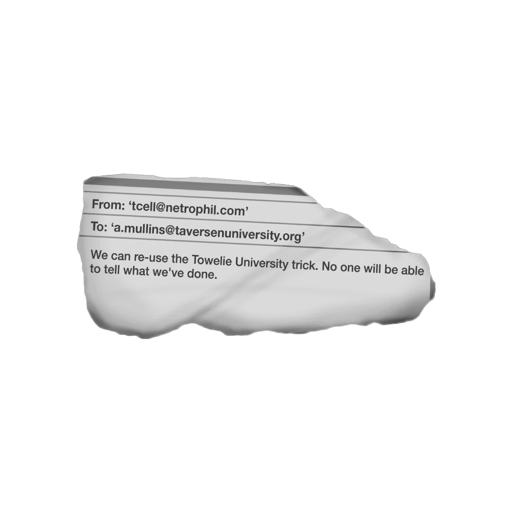 You thought this was a flier, but it seems like a photocopied printout of an email? You don’t really understand it. It’s from tcell@netrophil.com to a.mullins@taverseuniversity.org. And it’s only one line:
